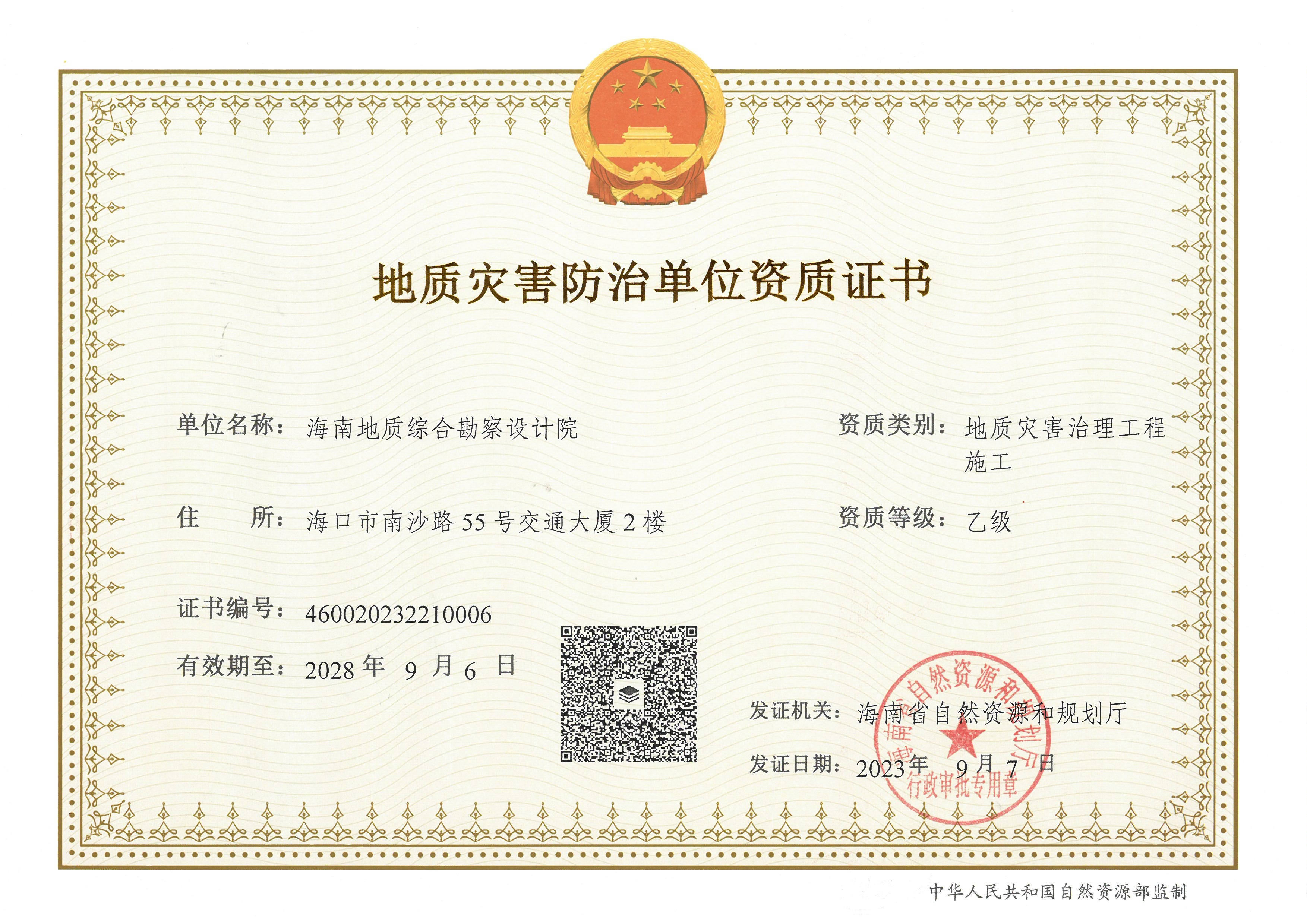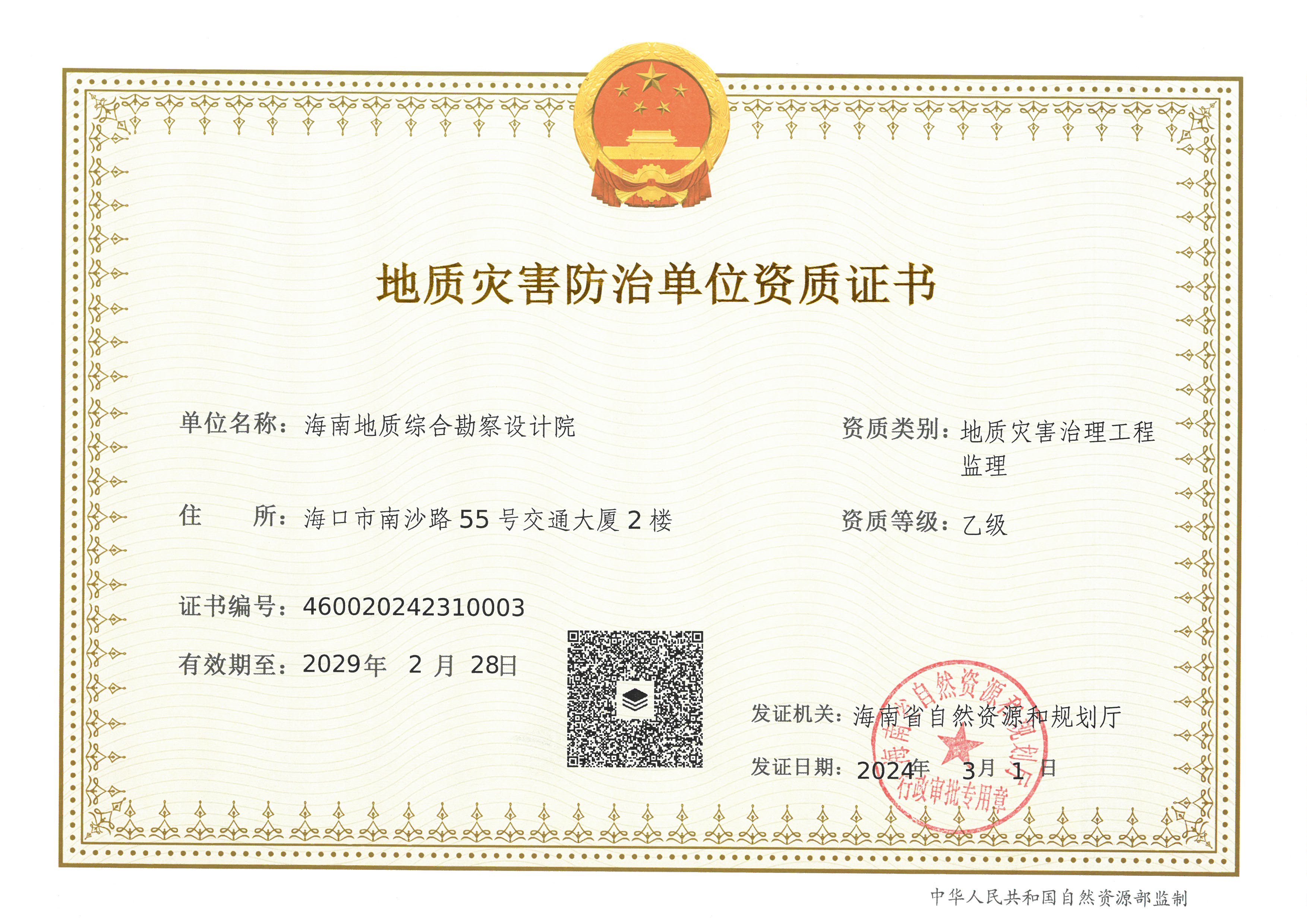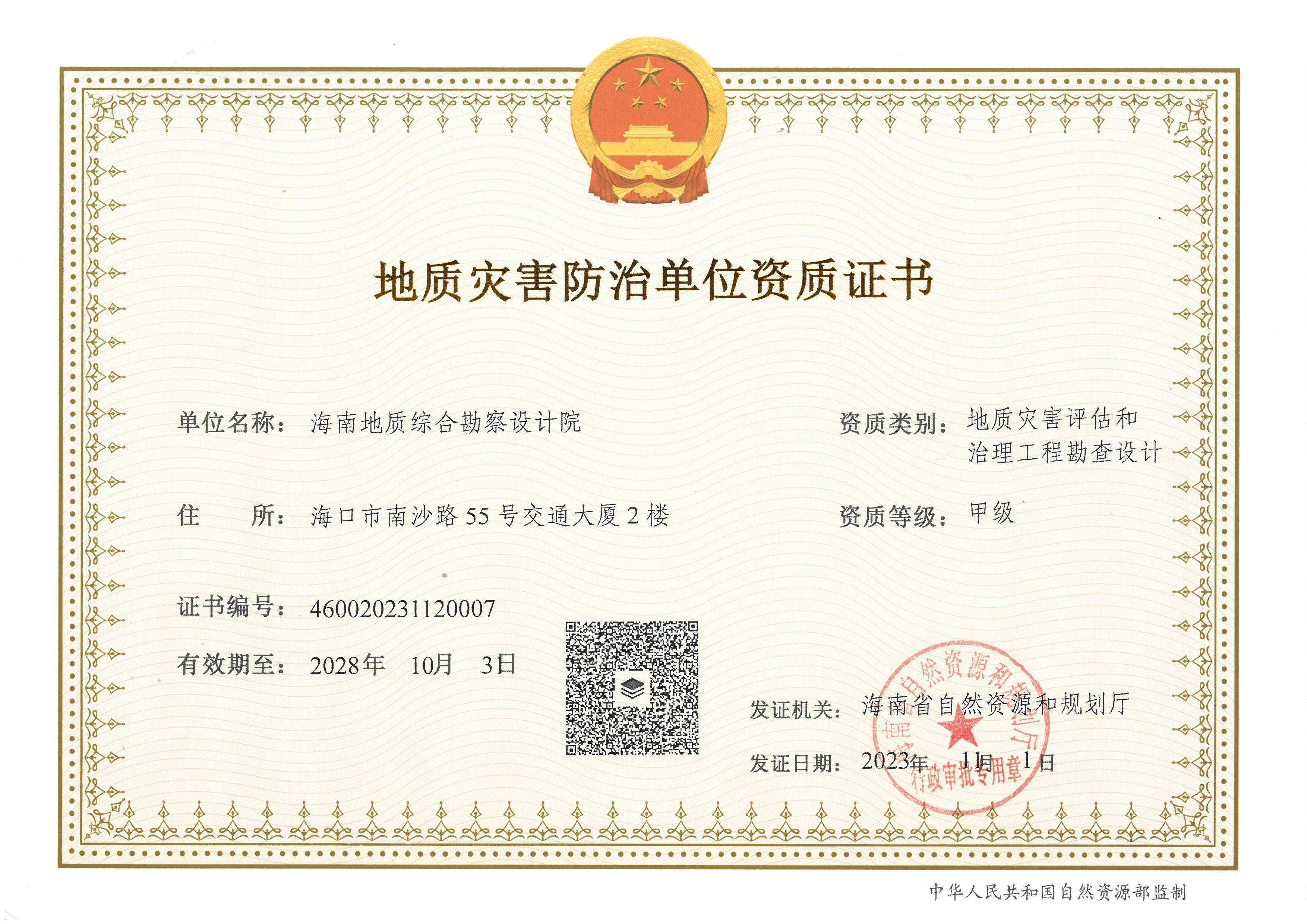 地质灾害评估和治理工程勘查设计甲级(有效期2028年10月3日)