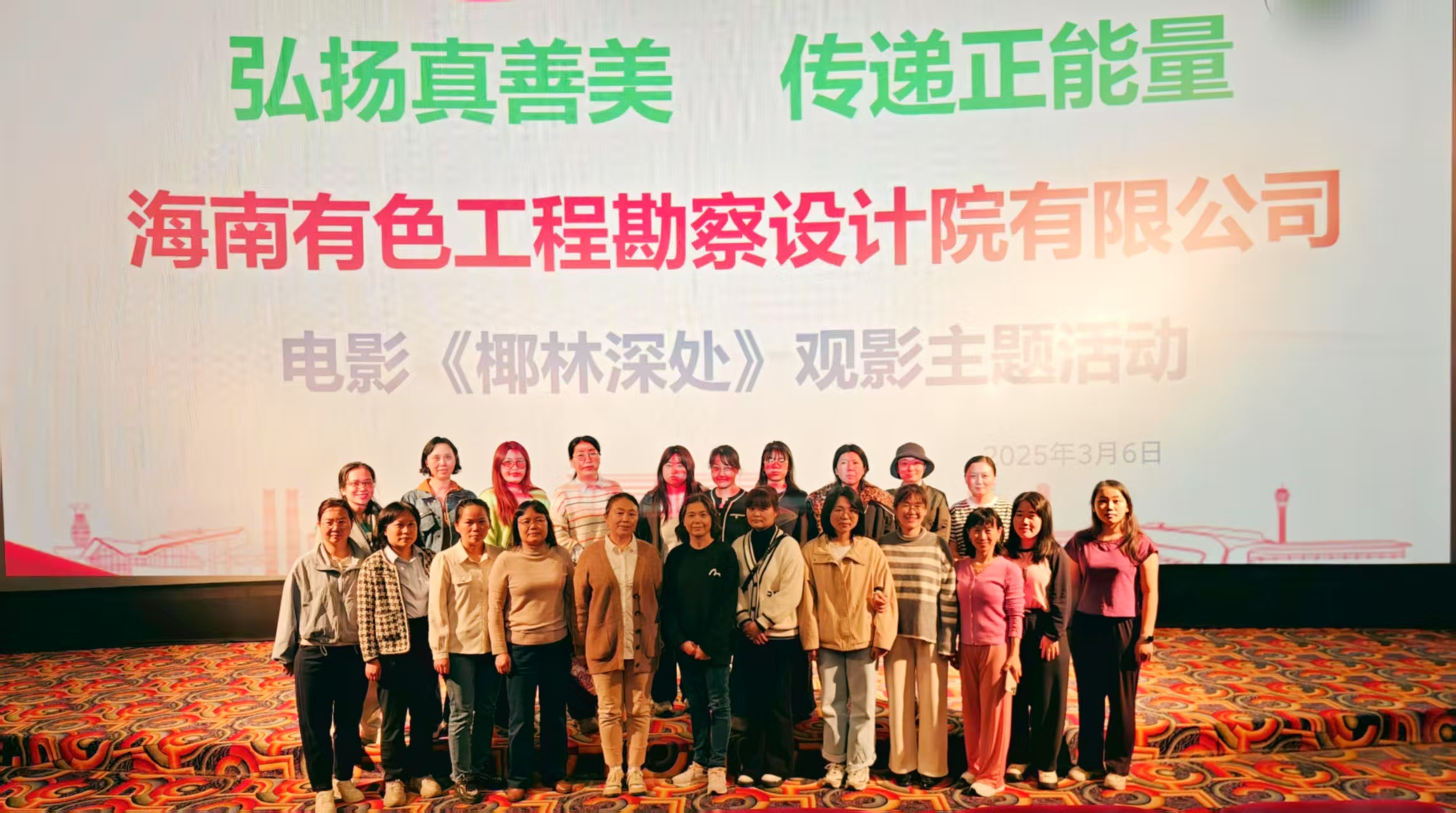 3月6-7日,集团所属海南有色工程勘察设计院有限公司、海南水文地质工程地质勘察院、海南地质综合勘察设计院、海南国际资源(集团)股份有限公司及海南地质物业管理有限公司等5家子公司,陆续开展主题观影活动,共组织80余名女职工观看海南本土励志电影《椰林深处》。